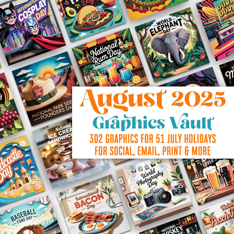 Tired of staring at that empty caption box? With August Graphics Vault, you’ll be flooding your feed faster than a melting ice cream cone. Seriously—98 scroll-stopping graphics that cover everything from National Banana Split Day to National Dog Day. Style without sweat.